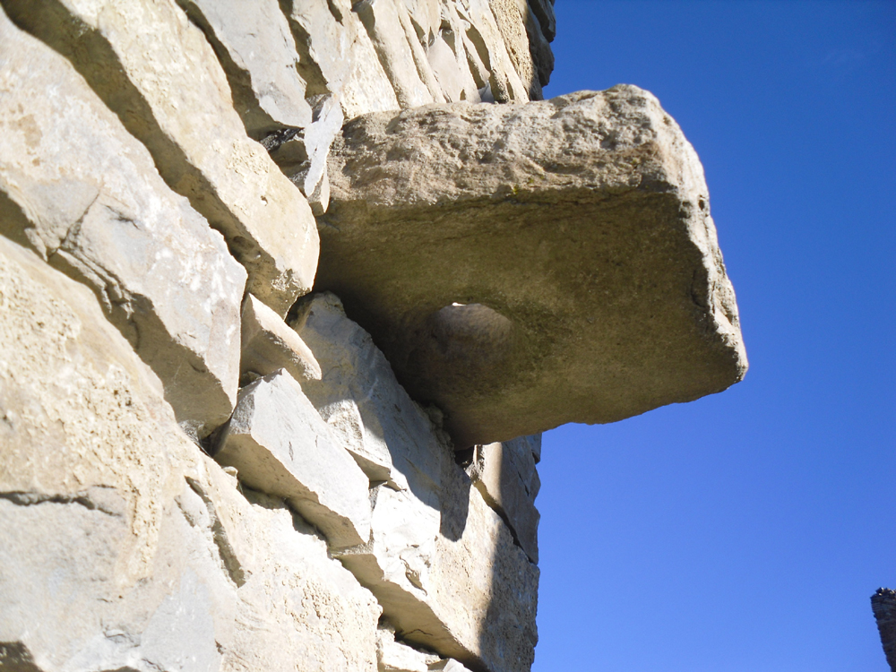 Encastrados a media altura en los pilares del lado SW se conservan restos de unas piezas monolíticas con un orificio interior circular de cierto dimámetro, que podrían ser piezas de un sistema temporal de cerramiento de madera de todo ese frente.