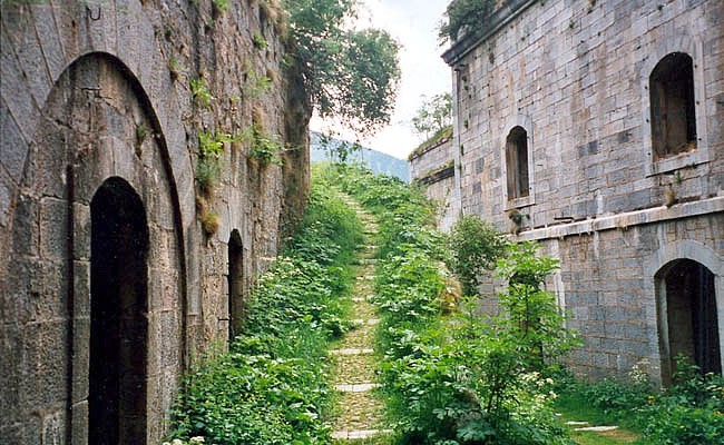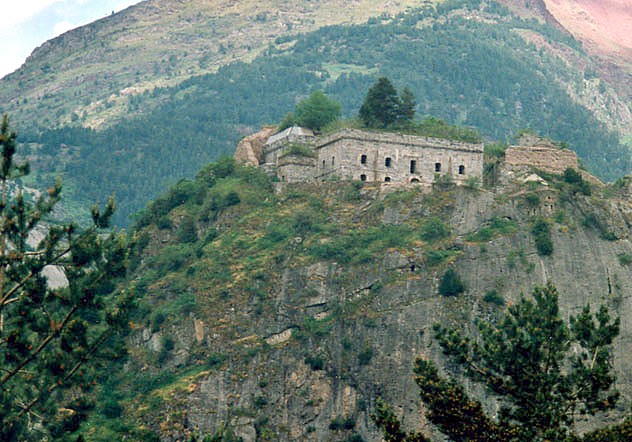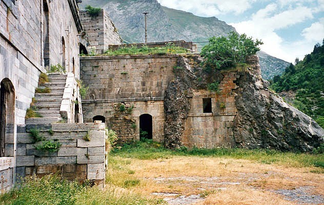 Una galería de defensa horadada en la roca y cerrada por un muro con aspilleras corre en la vertiente sur, descendiendo hasta una batería situada directamente sobre el río, destinada a batir la carretera.