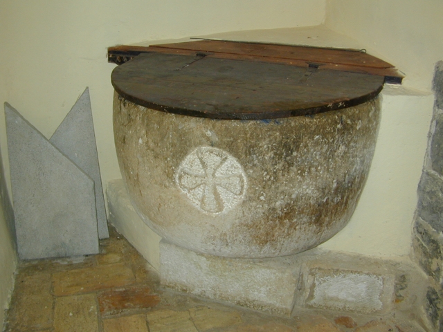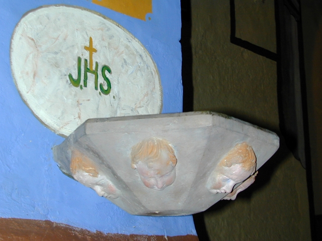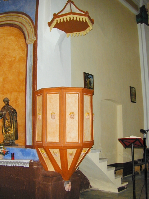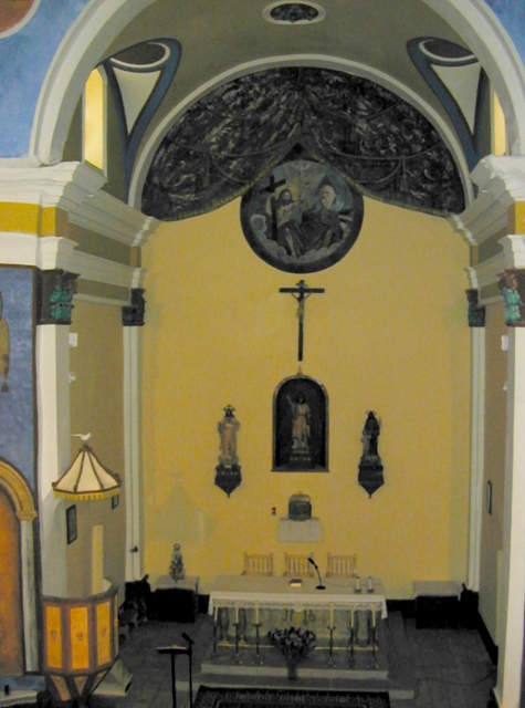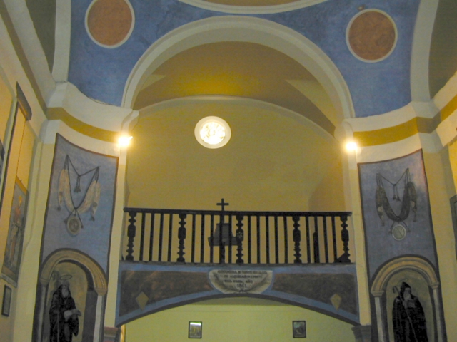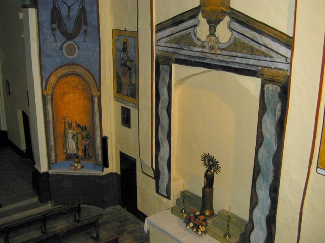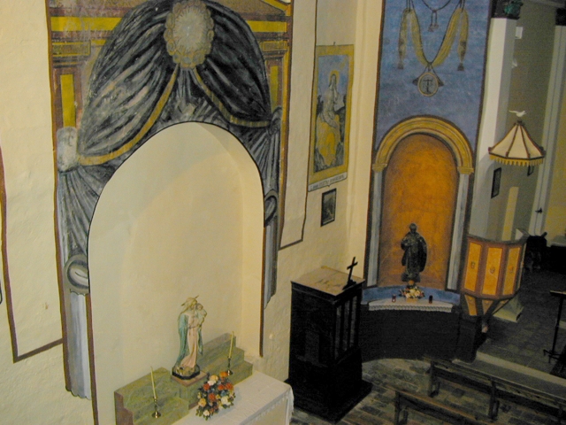 Parte de los muros están decorados con pintura mural. En las cuatro hornacinas de los ángulos de la nave aparecen pintados los cuatro evangelistas y las siguientes imágenes: la cruz con emblemas de la Pasión, dos anillos unidos por una corona, tau, báculo y campanilla (san Antonio Abad); mitra, báculo y cruz (san Benito).
