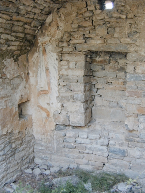 El muro este presenta una hornacina adintelada con dintel monolítico y reducido vano cuadrado sobre ella. Existen escasos restos de enlucido y encalado, con pintura mural, en la zona de la cabecera.