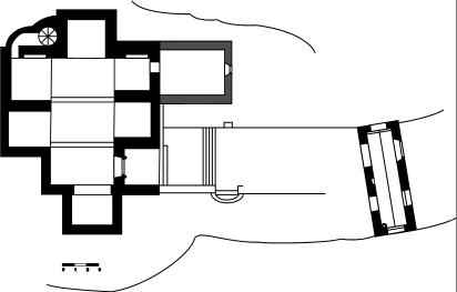 Consta de una nave rectangular dividida en tres tramos, con cabecera recta más estrecha y baja orientada al este, dos capillas a cada lado, una estancia a los pies para el coro y un nicho en el lado derecho del muro de los pies como baptisterio.