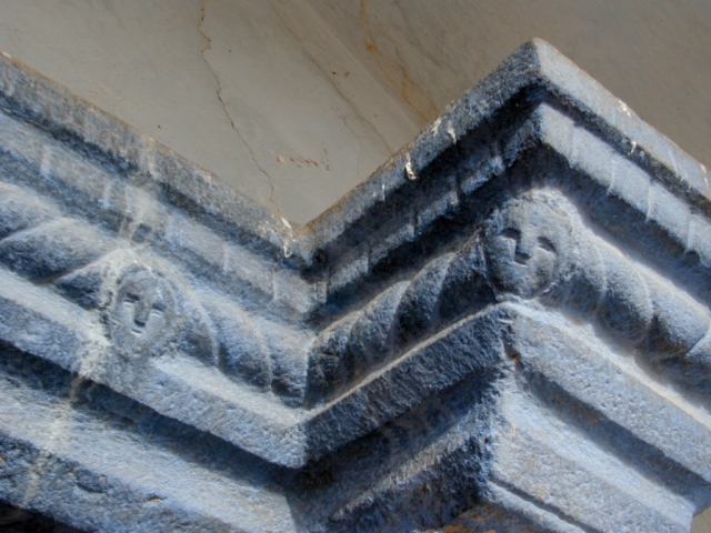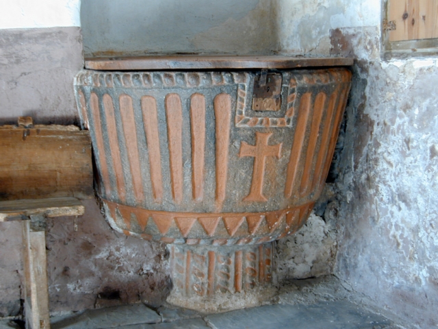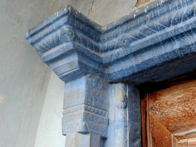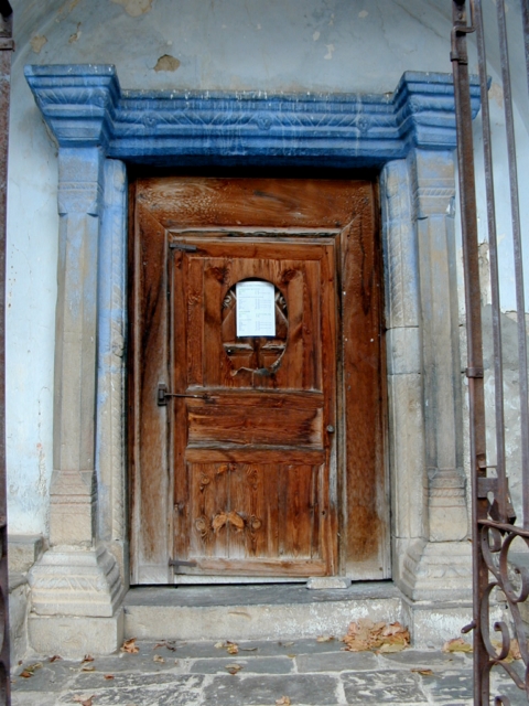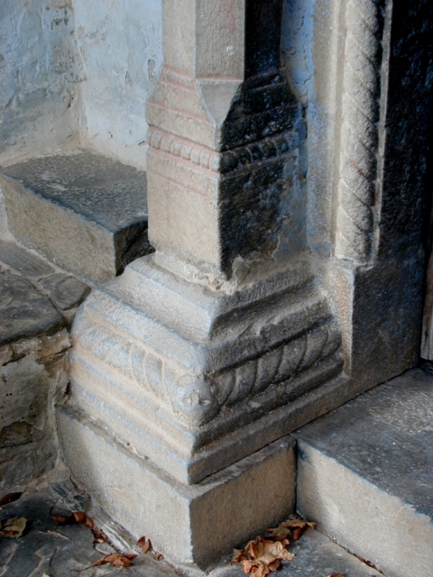 La puerta de la iglesia se halla al sur, precedida por pórtico cubierto con medio cañón. Es adintelada, con dintel moldurado con boceles entre los que se inserta una banda de sogueado decorada con tres cabezas en relieve, que se prolonga en los capiteles de las pilastras laterales. Está sostenido por pilastras octogonales, coronadas por capiteles decorados con sogueado; arrancan de basamento piramidal con decoración de molduras y sogueado, y basas también con decoración de sogueado. Al interior respecto a las pilastras, las jambas se decoran igualmente con una banda vertical sogueada, con un florón en relieve en el centro.
