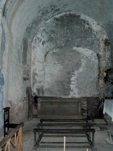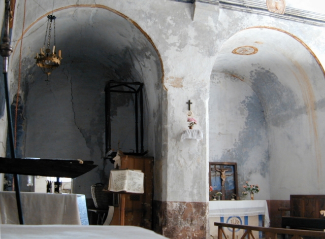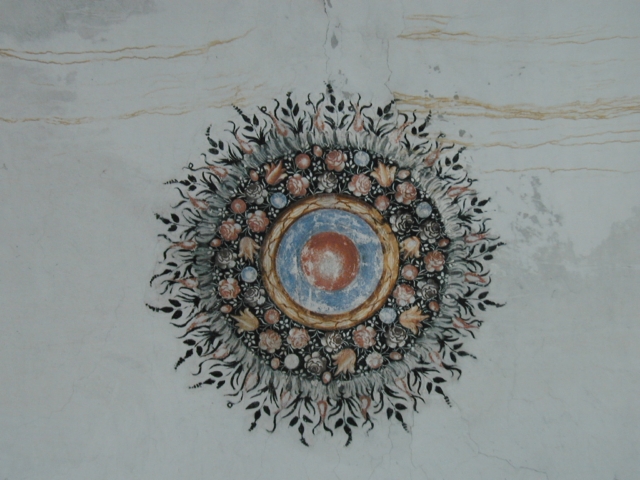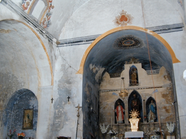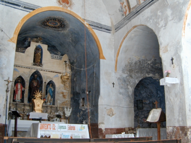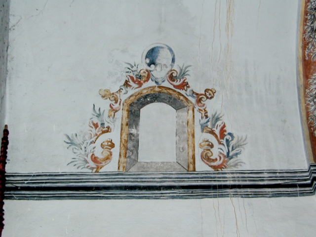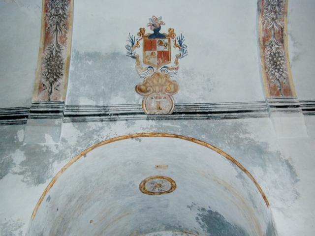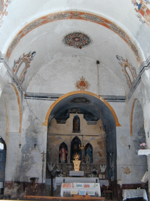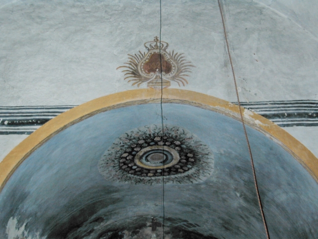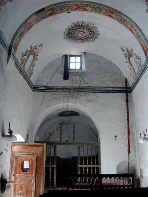 Decoración pictórica mural de tipo popular, con colores ocre, azul y rojo, representando en el centro de la bóveda de la nave coronas de flores y en los laterales una cornisa, falsas ventanas y un escudo enmarcados por rocallas.
