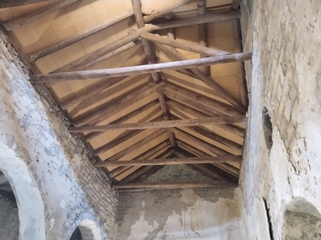 A los pies hay un coro bajo, cubierto con bóveda de medio cañón.