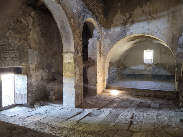 En el suelo del edificio quedan restos del pavimento de cantos rodados, formando dibujos en espina de pez.