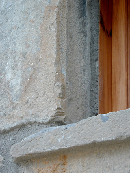 Sobre la puerta principal, en la fachada del piso que alberga las estancias domésticas, se sucede una hilera de ventanas adinteladas con varios detalles reseñables. En una de ellas, enmarcada por bloques monolíticos lisos, destaca una pequeña cara tallada, en relieve, en la parte baja de la jamba izquierda.