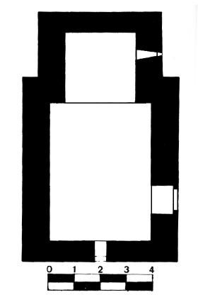 Tiene una ventana adintelada con derrame interno en el muro sur y otra sin derrame en el muro de los pies.