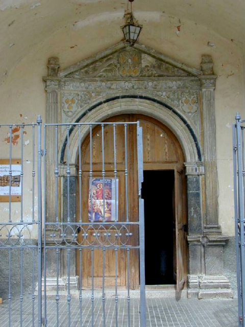 El acceso se encuentra en el lado sur. La portada está precedida por un sencillo pórtico de construcción más tardía, abierto al frente por gran vano de medio punto y cubierto por bóveda de cañón.
