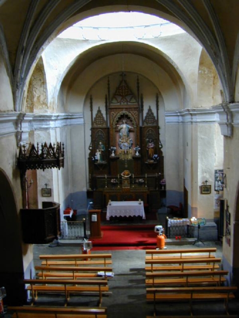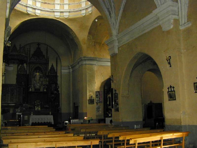 Al interior, consta de una única nave dividida en dos tramos desiguales, en el primero de los cuales se abren capillas laterales; crucero, y cabecera, a la que se adosa la sacristía. El espacio interior está unificado por un entablamento de yeso moldurado a la altura del arranque de las bóvedas, en el cual apean los nervios de las mismas.