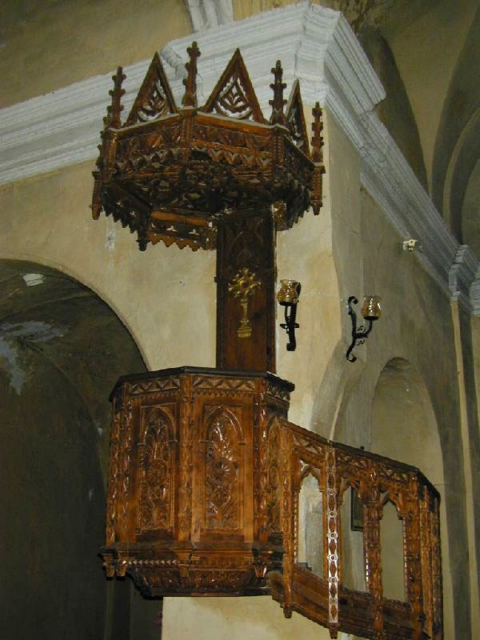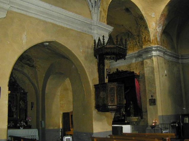 Tiene coro alto a los pies, sobre cubierta plana de vigas, con jácena frontal decorada mediante relieves vegetales y varias ménsulas de madera.