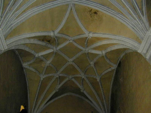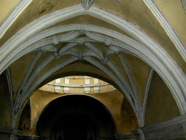 La nave presenta dos bóvedas de crucería estrellada, con diseños complejos y muy diferentes, separadas por un arco perpiaño apuntado que apea en grandes ménsulas voladas y molduradas integradas en el entablamento. Las capillas laterales tienen embocadura en arco de medio punto apuntado y planta cuadrangular, cubierta por bóveda de arista. Comunican con los brazos del crucero mediante grandes huecos en arco de medio punto.