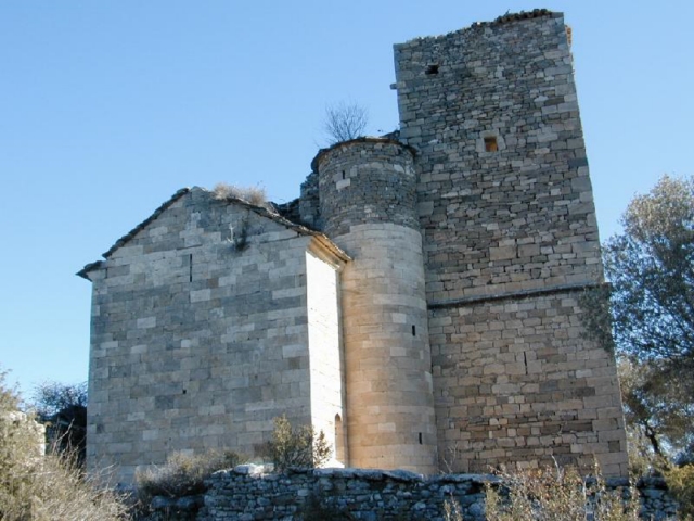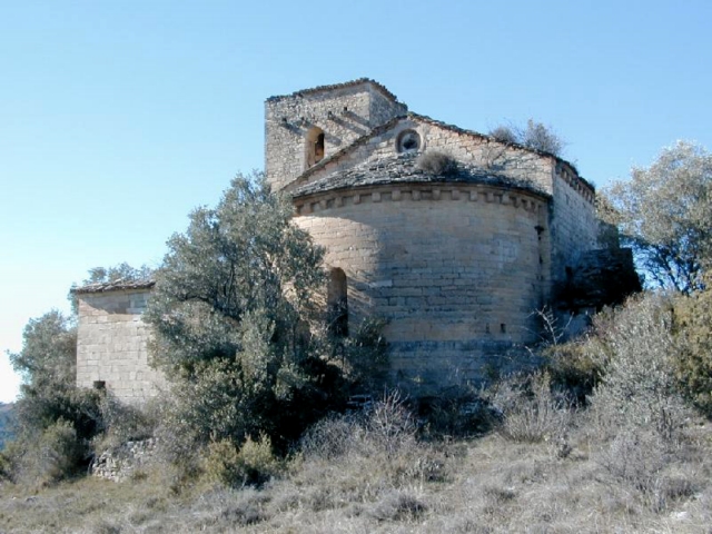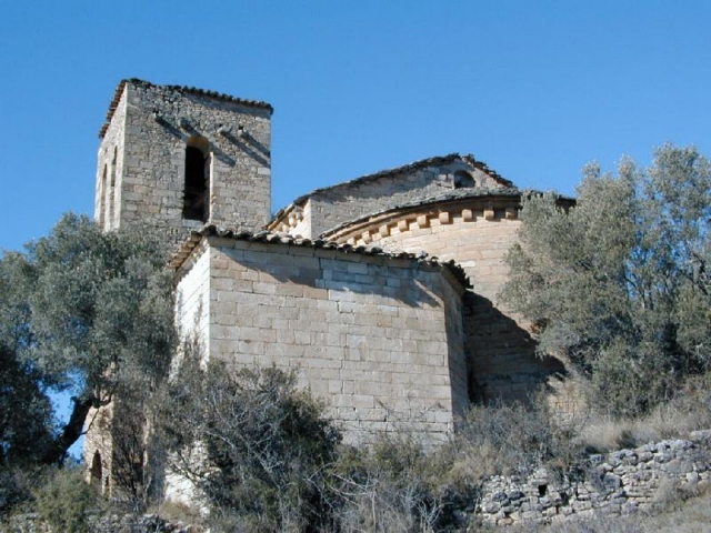 La obra original románica consta de una nave con cabecera semicircular orientada al este. La nave se prolonga hacia los pies a través de una capilla más estrecha, fruto de una ampliación posterior. A ambos lados de la nave se abren sendas capillas, que parecen pertenecer a la primera ampliación (realizada en 1564), aunque algunos elementos suscitan ciertas dudas. El edificio se completa con una sacristía adosada en el costado sur de la cabecera y una torre a los pies. Se ha hablado de tres fases, una primera románica; una segunda datada en 1564 en la que se añadirían las capillas laterales y de los pies, así como la portada y el pórtico; y una tercera, de 1672 (fecha que aparece en el reloj de sol existente en la torre) en la que se construirían la torre y la sacristía. Un análisis detallado de los paramentos no hace sino arrojar dudas acerca de esta datación, expuesta por José Antonio Adell en Catalunya Romanica y que quizá convendría revisar en algunos aspectos.