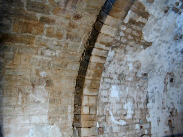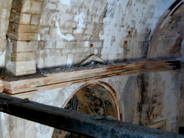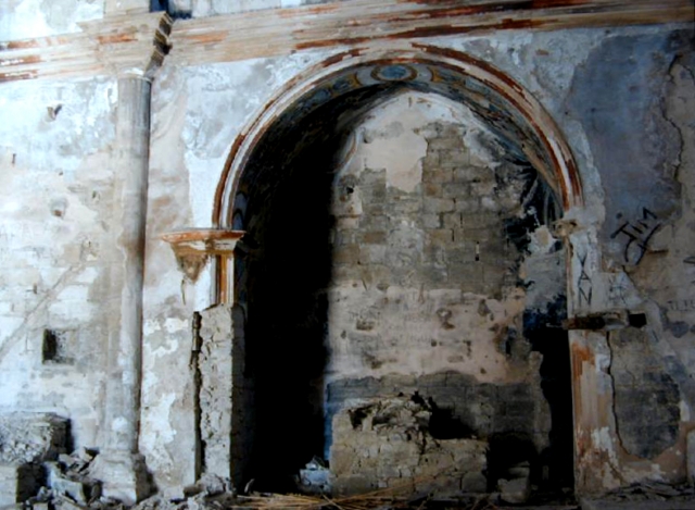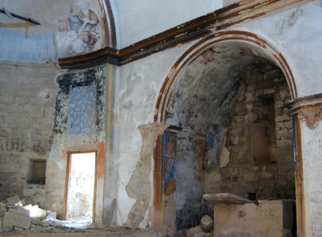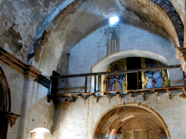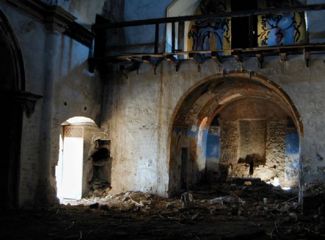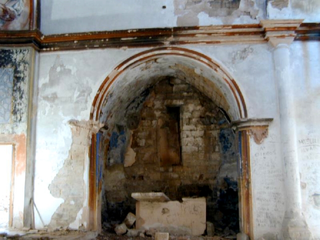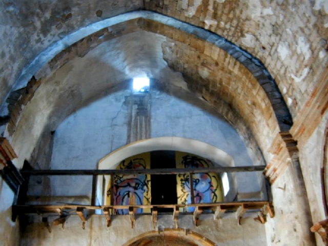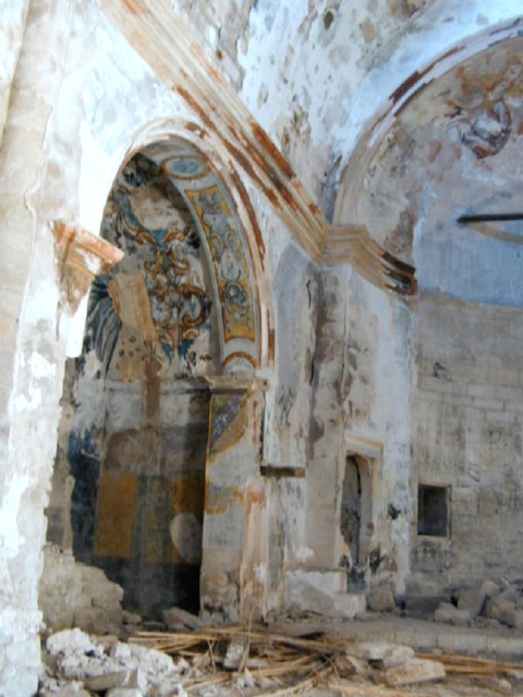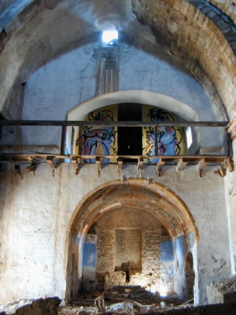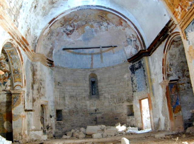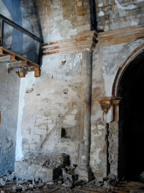 El interior, como queda dicho, consta de una única nave, cubierta por bóveda de cañón apuntado, dividida en dos tramos por fajón apuntado sobre columnas adosadas, y cabecera semicircular abierta directamente a la nave y cubierta por bóveda de cuarto de esfera. En ambos lados se abren sendas capillas de planta rectangular, cubiertas con bóvedas de cañón ligeramente apuntado. El desprendimiento del revoque de la zona adyacente a la capilla sur deja ver, a la izquierda, el arranque de un arco cuya altura sería sensiblemente inferior a la de la embocadura actual; este detalle complica todavía más la comprensión de la iglesia, que pudo tener desde su origen dos capillas laterales que fueron totalmente rehechas en el siglo XVI.