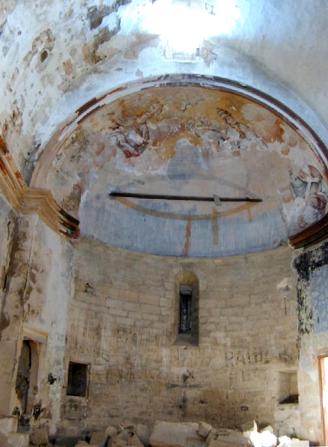 Las pinturas de la cabecera están muy deterioradas. En la bóveda se representaba la paloma que representa al Espíritu Santo rodeada de nubes y angelotes que sirven como apoyo a dos Padres de la Iglesia que sostienen en sus manos las figuras de sendos edificios. En los arranques del arco presbiterial se situaban otras dos figuras de santos, de gran tamaño, una de las cuales se ha perdido, estando la otra tan deteriorada que el personaje resulta inidentificable. A pesar de su deterioro, son quizá las que presentan una mayor calidad de la ejecución, debido a un fluido uso del color y menor rigidez y linealidad que el resto.