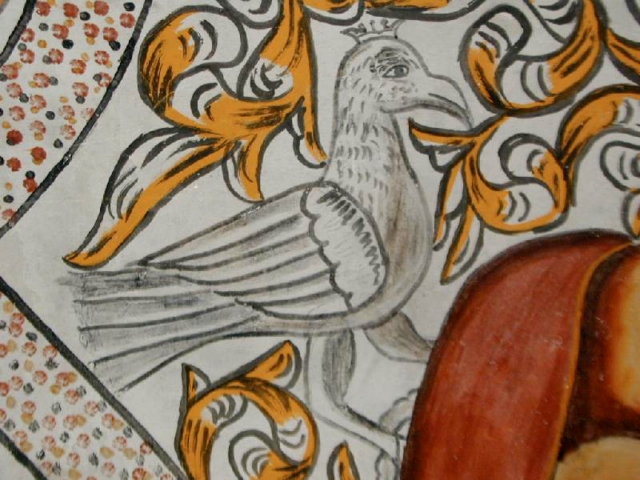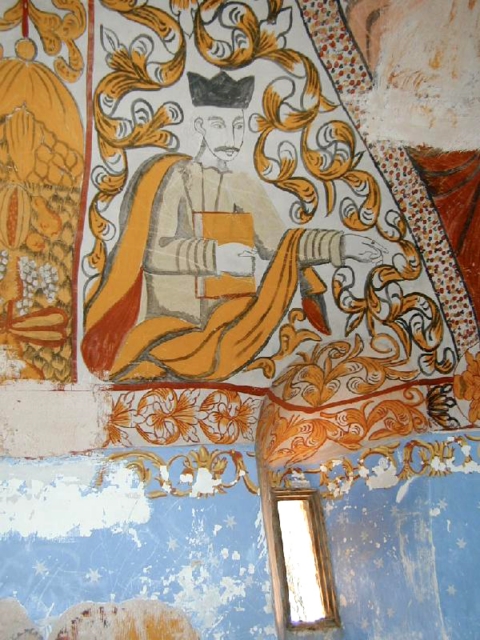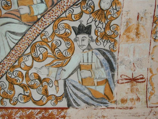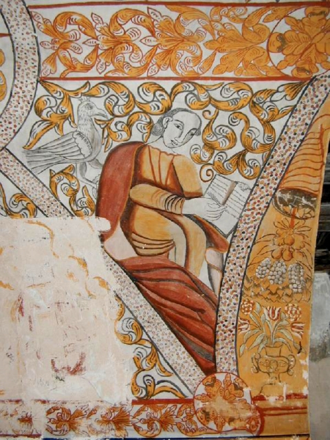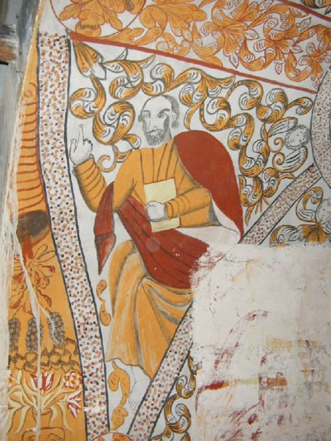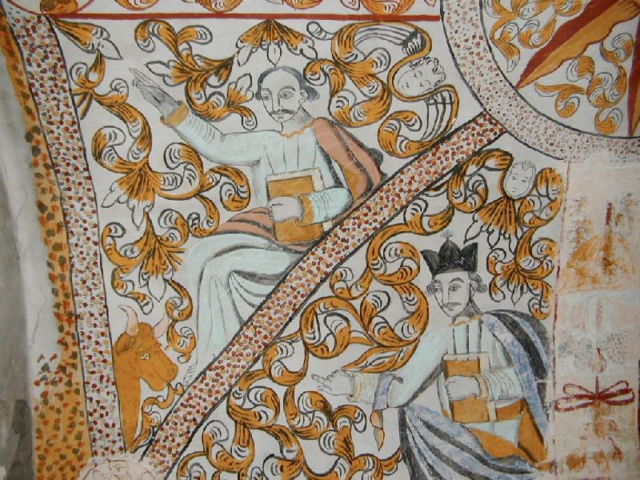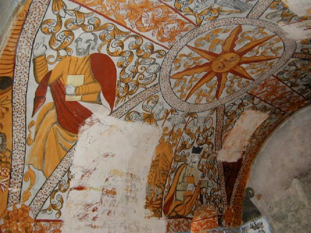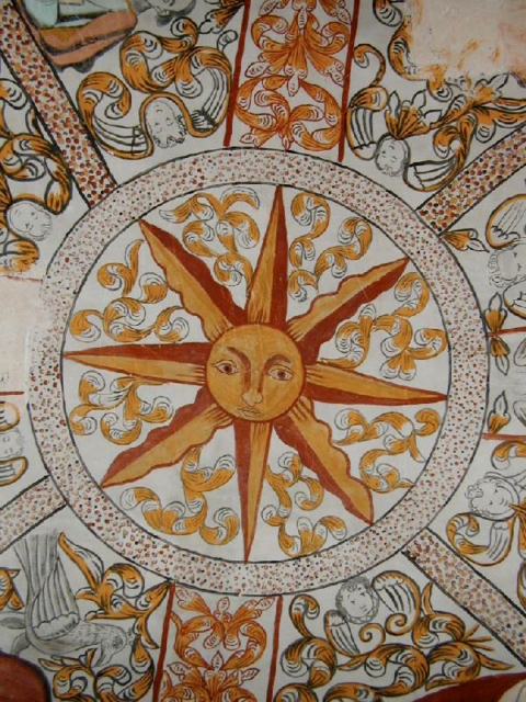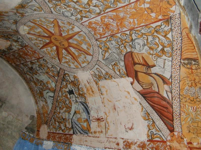 Desde el punto de vista iconográfico, el conjunto más interesante es el de la capilla bautismal, situada a los pies, que se conserva casi completo y en relativo buen estado. Es una capilla de planta rectangular, cubierta con bóveda de medio cañón cuya superficie está íntegramente decorada con imágenes. En la parte central de la bóveda hay una imagen de un sol con rostro humano (figura que suele asociarse con Cristo), del que parten de forma radial una serie de segmentos que dividen el espacio en ocho secciones en las que se disponen otras tantas figuras, dos de las cuales se han perdido. Las seis restantes representan a los cuatro evangelistas, separados por las imágenes de dos personajes con atuendos eclesiásticos, quizá relacionados con la dotación de la capilla. Están rodeados por una profusa decoración dieciochesca a base de guirnaldas vegetales, jarrones y angelotes. Se caracterizan por un dibujo muy marcado a base de gruesas líneas negras en las que se disponen los campos planos de color.