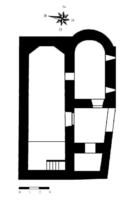 El cuerpo meridional, donde se encuentra el acceso, consta de pórtico, capilla bautismal y capilla. El atrio es de planta rectangular, abierto al sur en arco rebajado. La portada de la iglesia es en arco de medio punto moldurado con baquetones. La capilla bautismal es un pequeño espacio cuadrangular. La capilla del otro lado (posible iglesia original) tiene una nave rectangular con cabecera semicircular, cuyo trazado no llega a completarse al ser interrumpido por el muro lateral de la iglesia. Cubre con cúpula semiesférica, con linterna octogonal, en cuatro de cuyos lados se abren pequeños vanos de medio punto. Presenta comunicación con la iglesia a través de uno de sus muros laterales.