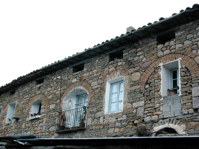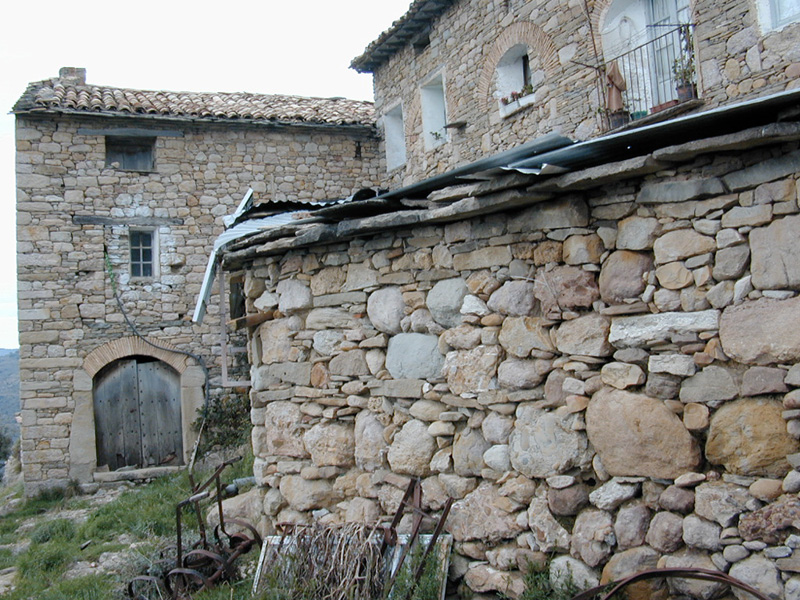 Casa: es un bloque rectangular de mampostería de muy distintos tamaños y ladrillo, con cubierta de teja a dos aguas. Se sitúa en un desnivel del terreno, por lo que a la plaza únicamente da la parte superior de la fachada trasera, mientras que la fachada delantera consta de cuatro plantas. Ante ella hay un patio descubierto, cercado por un murete de mampostería, que no da lugar sin embargo a la estructura característica de la casa patio debido a la falta de espacio, que obligó a edificar las construcciones auxiliares al otro lado del camino.