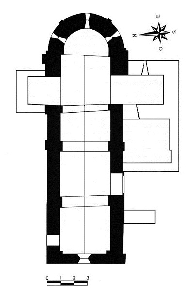 Se trata de una iglesia de una sola nave, con dos capillas laterales a modo de crucero y cabecera semicircular orientada al este.