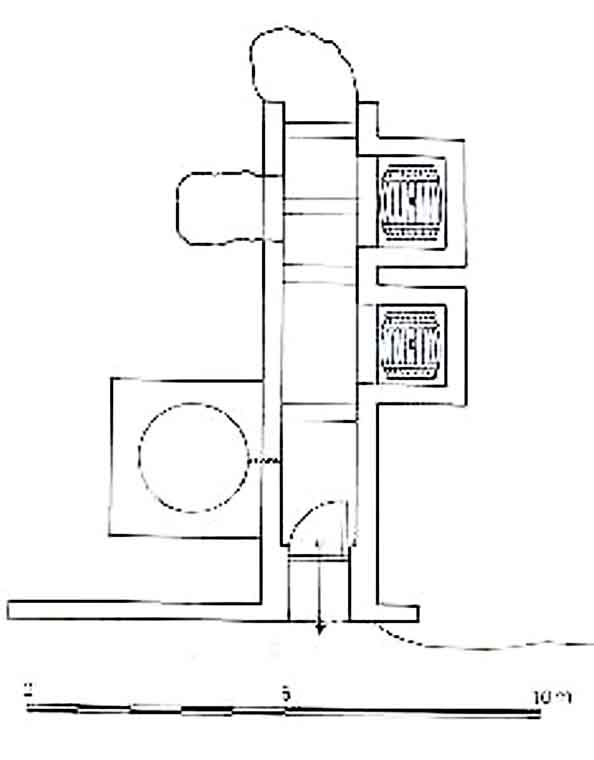 El desaparecido lagar se encontraba al comienzo de la galería, a la izquierda. Tenía sección circular y estaba cobijado en su parte superior por una estructura de obra.