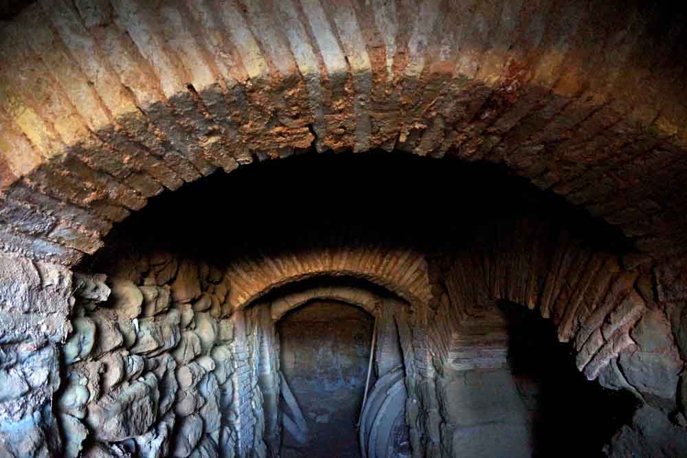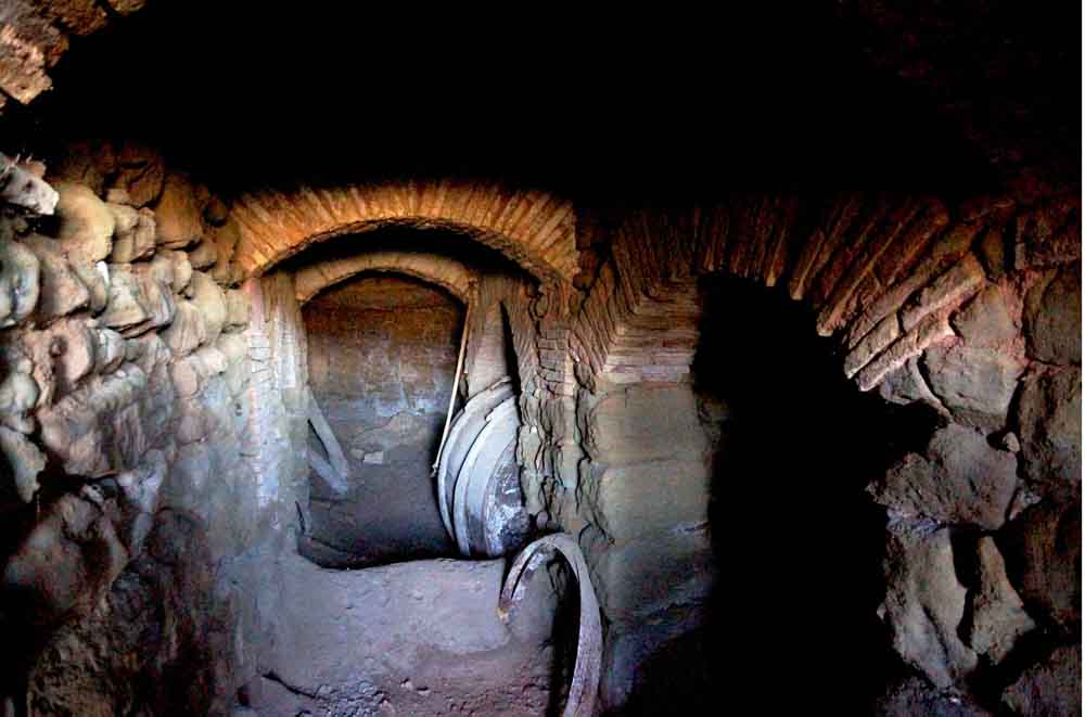 A ambos lados de la galería se abren “capillas” excavadas de distintos tamaños para albergar las cubas, abiertas al pasillo central mediante arcos de ladrillo (tanto de medio punto como rebajados) que apean en sillares de arenisca de labra tosca.