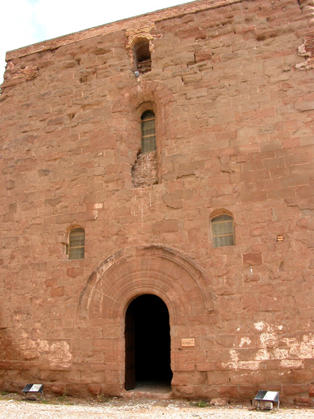 En el muro sur de la capilla se abrieron dos ventanas de iluminación cuyo estado de conservación es muy deficiente, por lo que su descripción resulta problemática. Se han considerado tradicionalmente como piezas reutilizadas procedentes de un edificio prerrománico, aunque estudios recientes (Arilla, 2005) la consideran contemporánea a la fábrica de la iglesia, si bien admitiendo que su decoración resulta atípica y exótica en el contexto del arte románico aragonés. La ventana más occidental, tabicada con ladrillo, presenta arco de medio punto con dovelas al exterior muy rasgadas, en las que se concentra una decoración geométrica en bajorrelieve. Dicha ornamentación externa, trazada a compás y enmarcada en cada una de las dovelas por un listel perimetral, configura elementos, simétricos en cada una de las piezas, que recuerdan motivos solares, tales como rosas hexapétalas, o cruces patadas. En el intradós del arco se perciben restos que parecen indicar que éste, como su gemelo oriental, fueron polilobulados o bien festoneados. Por último, es seguro que esta ventana occidental presentaba sendas columnitas apeadas en capiteles, idénticas a las de la ventana oriental, ya que persiste el espacio dejado por las mismas en las jambas del arco.