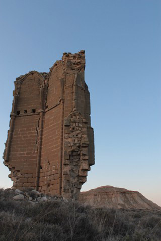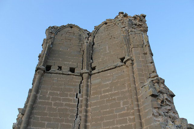 Lo que queda actualmente son dos paños del ábside poligonal, de elevada altura, construidos en piedra sillar arenisca muy bien escuadrada, donde aparecen abundantes marcas de cantero, similares a las de la antigua iglesia de San Salvador de Pallaruelo de Monegros.