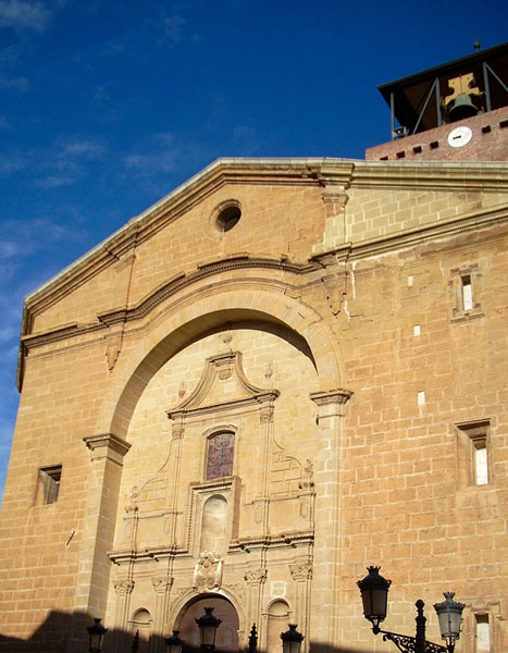 La fachada es austera de piedra arenisca rematada por un tímpano triangular. En la misma se abre la portada, fechada en 1766 y con las armas de los Duques de Híjar, cobijada por un arco resaltado que la protege de la intemperie. La portada se compone de dos cuerpos en altura siendo muy estilizada y esquemática. El inferior, se compone de la puerta de acceso al templo, que abre en arco de medio punto. Se enmarca por dos pares de pilastras que soportan capiteles corintios y a su vez el cuerpo superior. Entre las pilastras adosadas, se abren unas hornacinas en las que originalmente habría figuras. El cuerpo superior se quiebra en el centro para acoger otra hornacina de mayor tamaño ubicada sobre la puerta. Sobre la hornacina, se abre una ventana cuadrangular. Este conjunto de hornacina y ventana, se enmarca por un par de pilastras adosadas de menor tamaño que en el cuerpo inferior, y unos elementos sigmaformes, hacen la transición hasta igualar el ancho del cuerpo superior con el inferior. El remate es un tímpano triangular de perfil curvo.