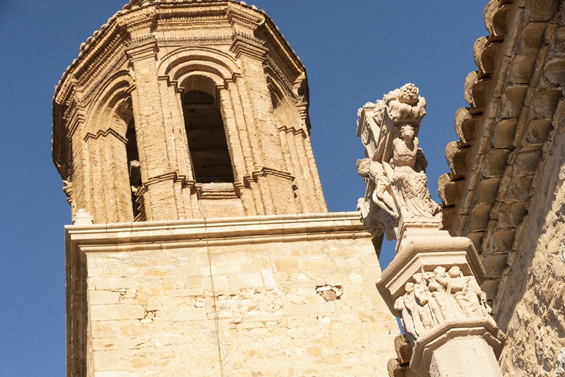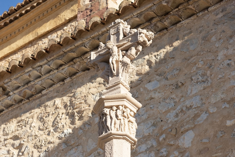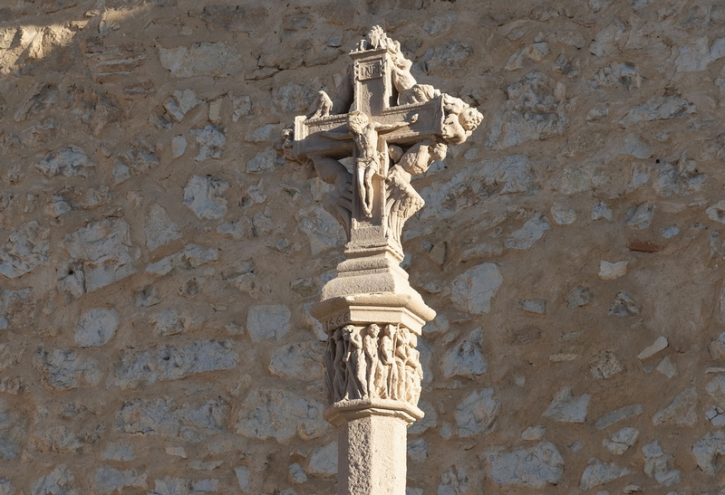 De ella arranca el fuste, muy esbelto, de sección octogonal y totalmente liso. Está rematada por un capitel o tambor también octogonal en torno al cual se disponen, en acusado relieve y sin ninguna partición, múltiples figuras de santos que hasta ahora no han sido identificados. En el remate del capitel consta incisa la fecha de 1566.