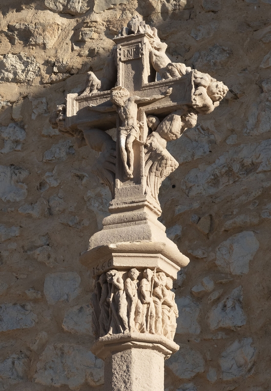 Está rematado por la cruz, muy ornamentada, con florones en los extremos de los brazos horizontales; además, ina pareja de arpías sostiene dichos brazos mientras una segunda pareja de personajes se encuentra recostada sobre ellos. En el frente de la cruz hay una imagen de bulto de Cristo crucificado, de acusado realismo y magnífica talla.