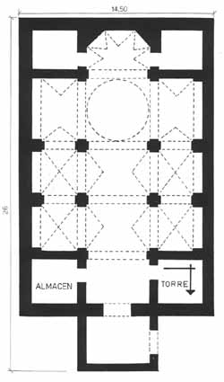 Posee tres naves, de dos tramos cada una, crucero y capilla mayor poligonal. La nave central y los brazos del crucero están cubiertos por bóvedas de medio cañón con lunetos. Las laterales lo hacen con bóvedas de arista y el crucero con cúpula sobre pechinas. Esta estructura no se acusa en el exterior, que presenta un macizo volumen de mampostería con cornisa de ladrillo y cubierta a cuatro aguas. Se accede al interior a través de un pórtico añadido, situado a los pies, y en el lado de la epístola, junto a la entrada, se sitúa la torre.