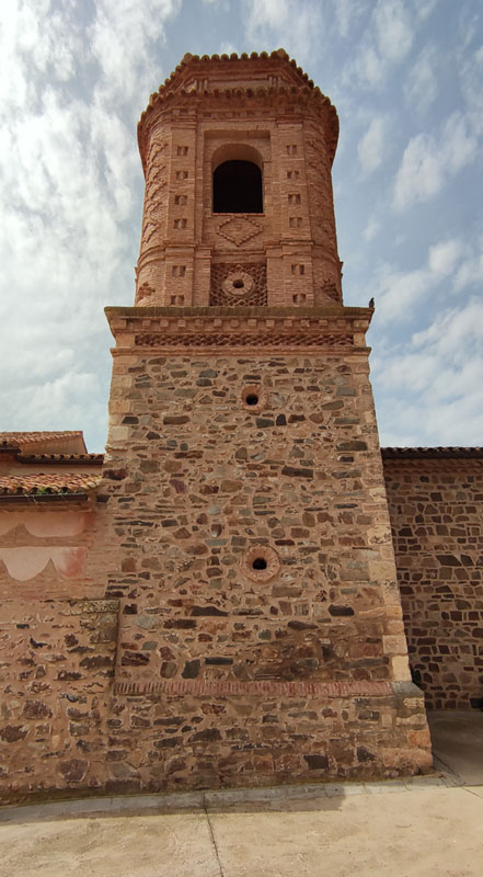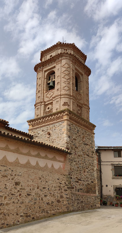 La torre, adosada a los pies en el ángulo norte, presenta estructura cristiana; esta tipología se caracteriza por su estructura hueca con disposición interior en pisos, comunicados por escalera y cubiertas con bóveda de cañón o crucería, o bien techumbre de madera. Consta de dos cuerpos de planta cuadrada, redondeados los ángulos del cuerpo superior, que además está retranqueado. El cuerpo inferior, en mampostería con aristas de sillar, queda rematado en la zona del alero por una banda de esquinillas a tresbolillo e imposta de ménsulas en ladrillo; el cuerpo superior, construido completamente en ladrillo, queda abierto en sus cuatro caras por huecos de medio punto con alfiz que albergan las campanas; el resto de la superficie mural esta decorado a base de frisos y paños de esquinillas, ladrillos aplantillados curvos y cruces de múltiples brazos formando rombos. Un alero con imposta de ménsulas y friso de esquinillas sostiene un tejadillo, sobre el que se levanta un pequeño cuerpo ochavado de menores dimensiones también en ladrillo y con pilastras y motivos en ladrillo resaltado.