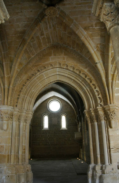 La puerta abre al claustro mediante un vano apuntado, cuyo intradós se decoró con puntas de diamante, rodeado de dos arquivoltas aboceladas, la exterior está decorada con formas lobuladas; el conjunto apea en columnillas adosadas a las jambas de fuste cilíndrico muy estilizado con capiteles decorados con motivos vegetales entrelazados.
