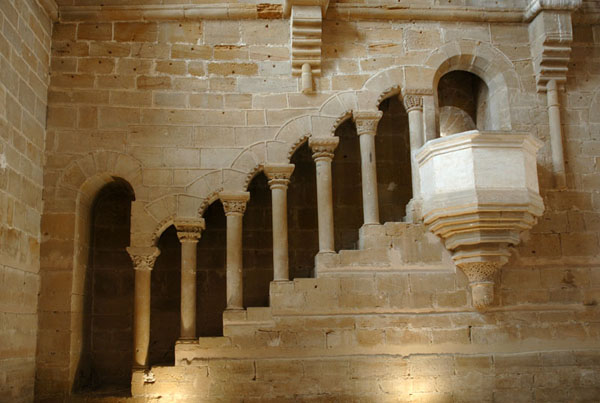 El púlpito se sitúa al fondo del refectorio a la derecha, la escalera se excavó en el muro y se cubrió con bóvedas en arco rampante que apean en columnas de fuste cilíndrico con capiteles decorados con motivos vegetales. El ambón propiamente dicho es un semioctógono, sostenido por una ménsula muy grande a la que se accede a través de la escalera.