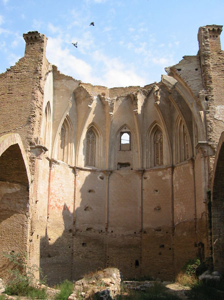 Se cubría con bóveda de crucería con nervaduras abaquetonadas que apean en columnillas con capiteles lisos pintados sobre los que discurre la imposta que da paso a los ventanales, abocinados en molduras de ladrillo aplantillado y formados por dos arquillos apuntados polilobulados decorados, separados por mainel poligonal esgrafiado y coronados con un rosetón; algunos han sido cegados pero la mayoría conservan las celosía caladas en lazos de seis o con ataurique de palmetas y frutos.