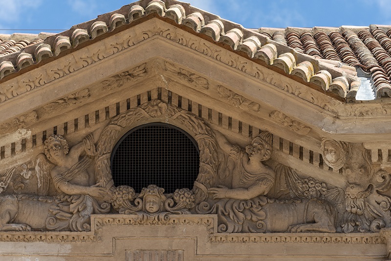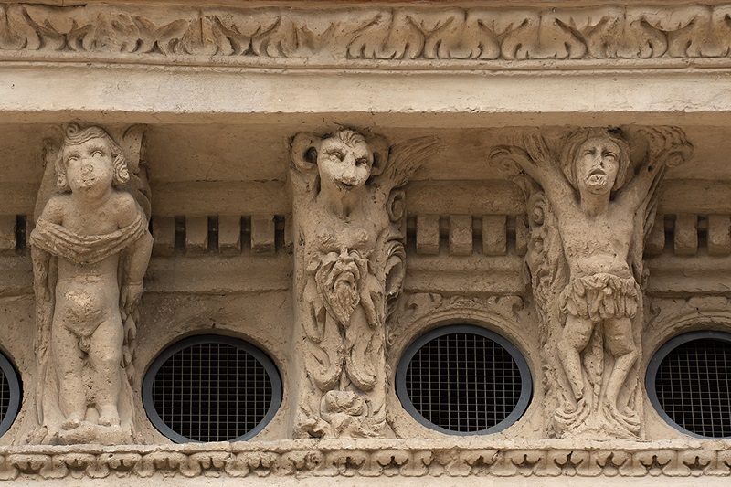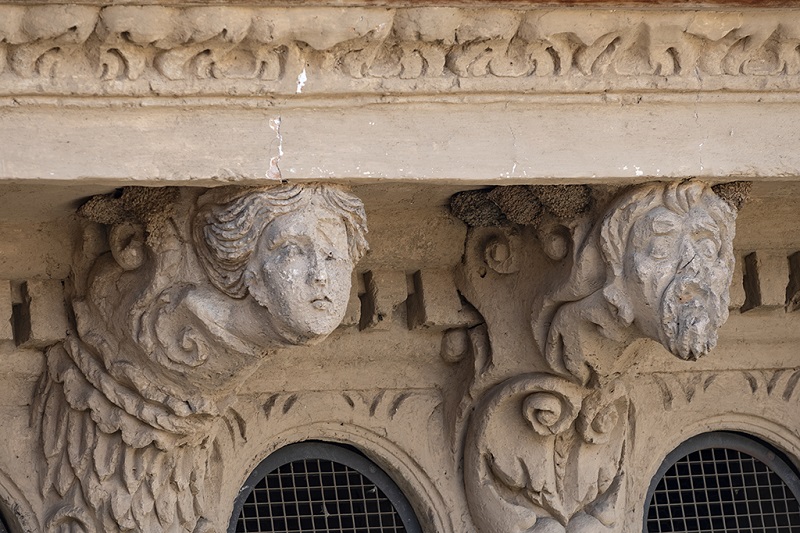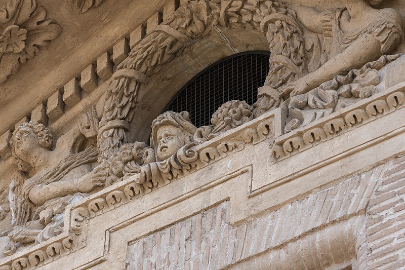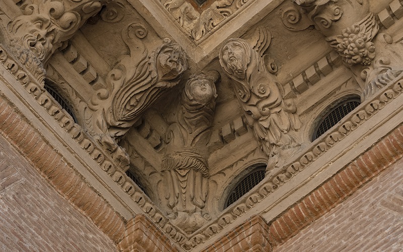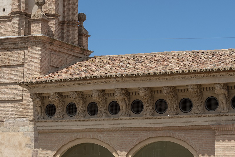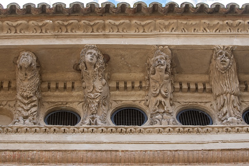La fachada delantera está construida en ladrillo sobre zócalo de piedra a modo de basamento abierto por los vanos que iluminan los sótanos. Presenta un cuerpo principal recorrido por pilastras toscanas, desarrolladas en toda la altura del edificio, sobre podios resaltados en el zócalo, que señalan los diferentes tramos en que se articula el muro continuo entre el extremo de la iglesia y el de la lonja. En el centro se dispone una portada abierta en arco de medio punto dovelado en piedra sillar que se abre hasta la primera planta. El conjunto se corona con una galería de óculos separados por ménsulas figuradas, esfinges, máscaras, atlantes en posiciones típicas o inesperadas con rostros gesticulantes, contraídos y atormentados, que sujetan un potente alero, todo ello realizado en yeso y dotando de una gran unidad compositiva y plasticidad a la galería. En la parte superior de la fachada el alero interrumpe la sucesión de ménsulas originando un frontón en el que dos centauros enmarcan un óculo central de mayor tamaño que el resto, quedando cerrado por un sófito de casetones, bajo el que se prolongan los dentículos que recorren todo el alero entre las ménsulas.