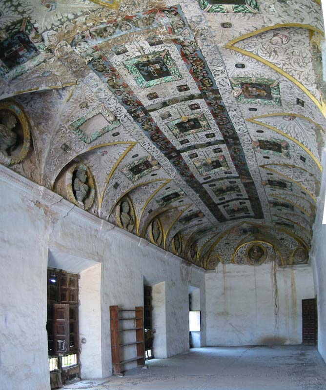 En el piso noble o planta principal existen varios salones, entre los que llama la atención el llamado Salón Pintado con una profusa decoración de yeserías y pintura mural. En el techo, lunetos y puntas de diamante flanquean una banda central ornamentada con roleos y diversas formas vegetales, donde se repite como tema principal el escudo heráldico del conde.